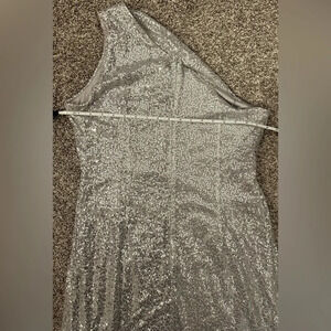 One shoulder silver sequence mini dress. Zippers in the back. Has a layer of mesh with sequence and a light gray slip dress underneath. Length when laying flat: 36 inches