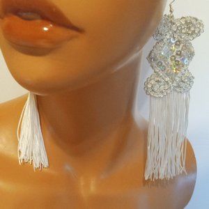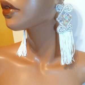 New -These beautiful and unique earrings are designed with silver sequins, organza embroidery fabric, white tassel fringe, and silver-colored earring hooks. The earrings have a pretty embroidery design embellished with silver sequins and a long white fringe. You can wear this style for many occasions. A great gift to yourself and someone else.
