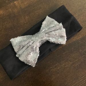 Silver sequin bow on black comfy stretch knit headband for girls. So cute and so comfy! Its on trend for year round use. This stretch knit headband is so soft and stretchy it fits sizes newborn to teen, making it worth the small investment. Get it in every color! It makes a Great gift for Christmas and/ or birthdays! 🎈 Silver sequin bow on black headband for babies and girls.