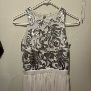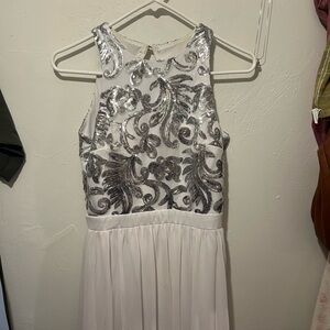 Elegant white dress with silver sequin embellishments. Perfect for special occasions.