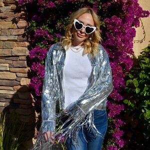 The perfect fun funky silver jacket to spice up any outfit! Great for your bachelorette or wedding day or get them plain for a country concert/Stagecoach outfit! Gift to yourself or your sparkly bride for her Nashville Bach/Disco Cowgirl Bach/Last Disco/Mamma M Bachelorette! Get these jackets plain or custom! A little cute, a little country, a little disco! Lots of uses for this amazing jacket