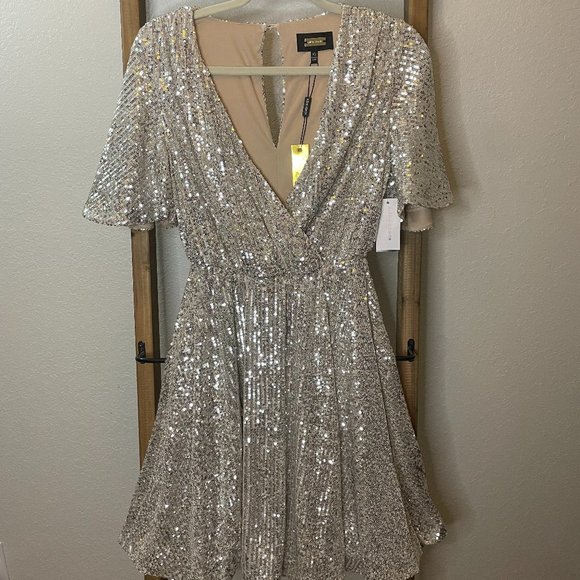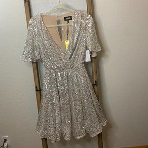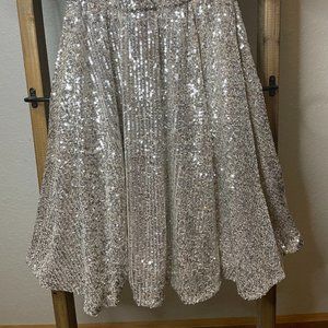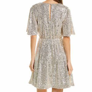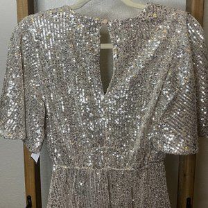 Oakless Fit & Flare, Sequin A-Line Dress in Silver with surplus bodice and flutter sleeves, Keyhole button closure, Dress is lined