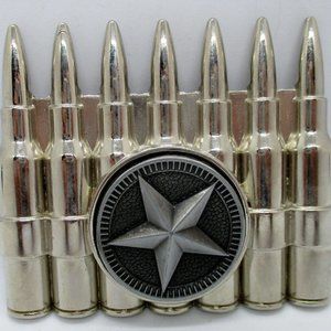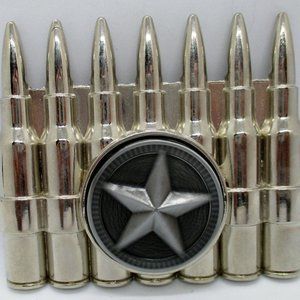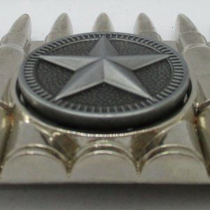Silver Seven Bullet Spinning Star Belt Buckle Fits a 1.50" wide belt Height: 3 1/4" Width: 4 3/4" Thickness: 1/2"