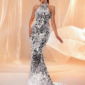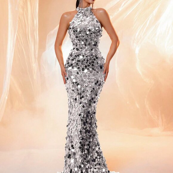 Turn heads in a silver, floor‑length evening gown that combines a sleek bodycon silhouette with a high waist and mermaid hem. The sleeveless, backless style features a halter neckline, contrast sequins and a discreet zipper, while a fully lined interior ensures comfort. Regular fit and a striking sequin finish make it ideal for glamorous events.