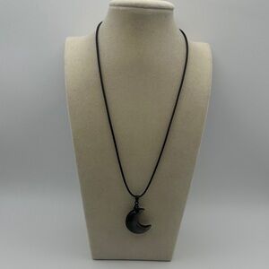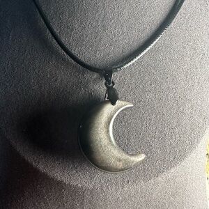 Beautiful silver sheen obsidian crescent moon pendant necklace. Pendant is about 1” long and wide. It’s on a black bail and 16” black rope (with 2” extender chain). It could be worn to feature either side. Both sides have a nice silver sheen.