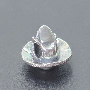 Unique silver-plated skull charm that is sporting a hat with yellow floral detail perfect for a Halloween accessory. It measures just over half an inch square and fits most charm bracelets like Pandora.