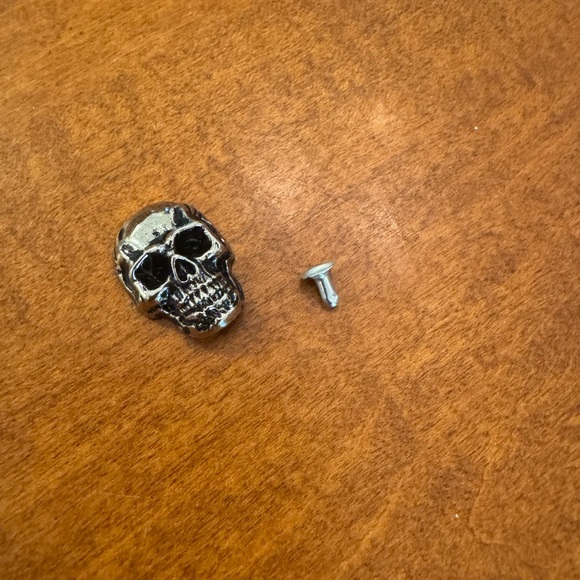 Silver skull stud button with intricate detailing. Perfect for adding a unique touch to clothing or accessories.