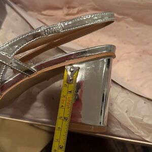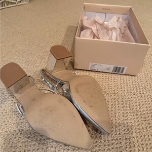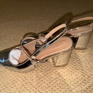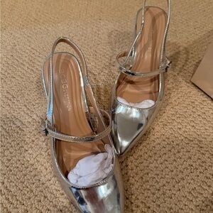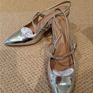 Chic metallic heels with a pointed toe. Slingback design for a secure fit. Ideal for elegant outings. Size 7 M