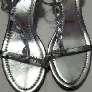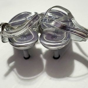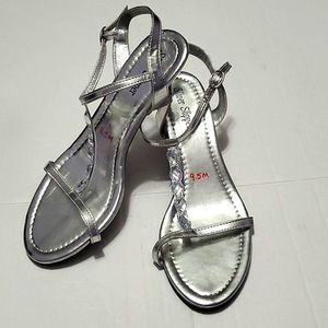 Silver T-strap kitten heels sandals with faux stones embellishment on the strap. Buckle closure on one side. Padded footbed and anti-skid rubber soles. All man made materials.
