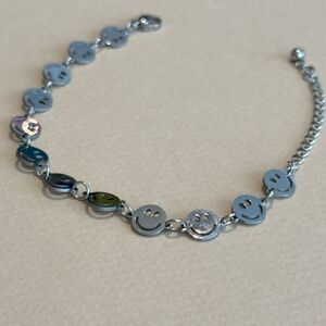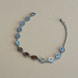 Add a touch of joy to your outfit with this silver smiley face bracelet. Perfect for any occasion.