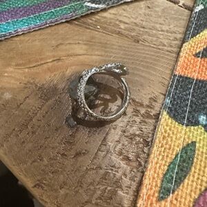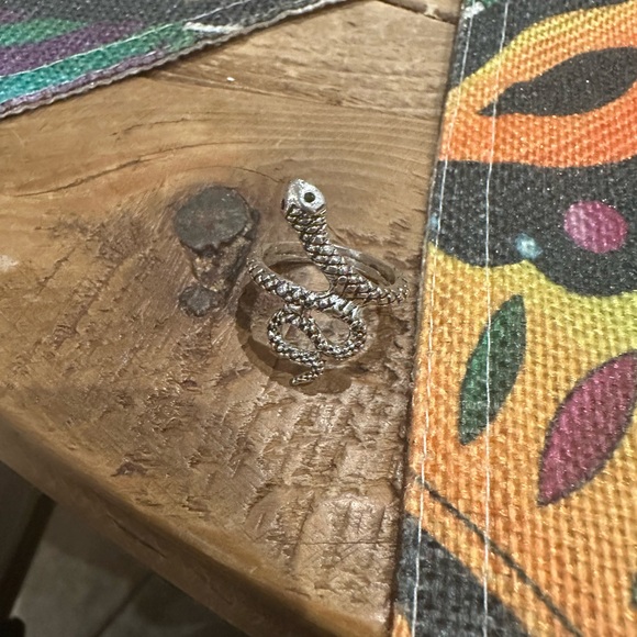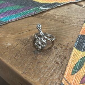 Stylish silver snake ring with intricate details. Perfect for adding a unique touch to any outfit.