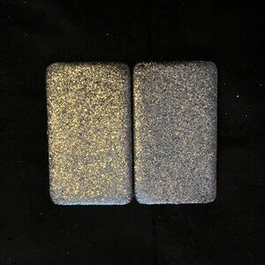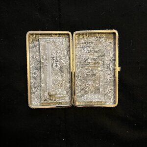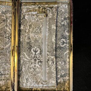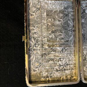 The exterior of this purse has silver ‘glitter’ which gives it a shiny, elegant look. The interior is lined with a gray and white subtle print. One (1) side of this purse/wallet has an open pocket with a zippered pocket attached. The other side also has an open pocket with ID/credit card slots. It has a snap/lock closure.