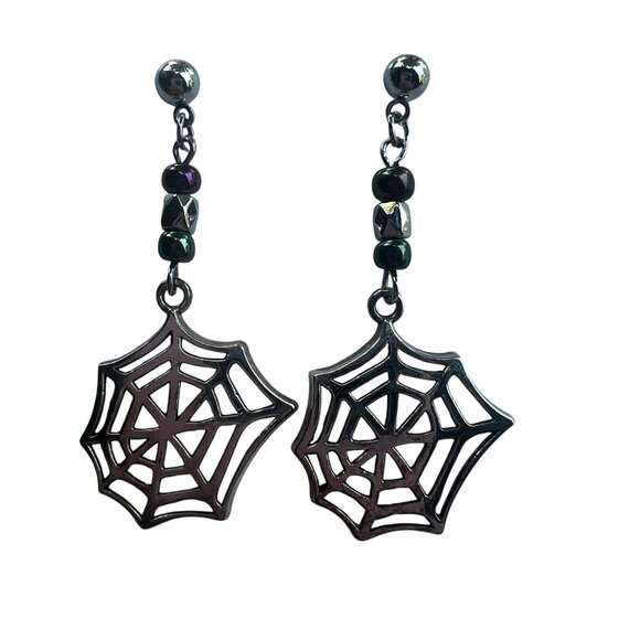 Silver Spider Web with Iridescent Beads Stud Earrings
