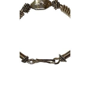 Primitive Style 925 Silver Spring Coil Spacer Bead Bracelet 23g S Hook Clasp, great for the Steam punk look. Very good condition. The primitive marking on the longer beads are not worn. No Makers Mark visible. Fairly heavy bracelet inside diameter around is 7"