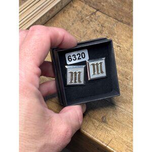 A striking pair of silver square cufflinks featuring gold initial 'M' design. Ideal for adding a distinguished touch to formal attire.