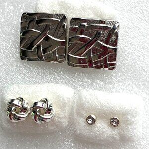 Silver Square Knot & Crystal Stud Pierced Earrings Set Of 3 A280