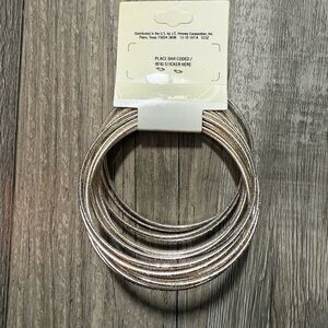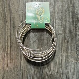 This set features multiple thin silver bracelets designed to be stacked on the wrist, offering a classic and versatile look. The simple metallic shine of the bangles makes them perfect for layering or wearing alone for a minimalist style.