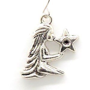 These zodiac earrings are silver-plated Virgo maiden, approximately 0.75" x 1" with a star incorporated into the design. The earrings use silver-plated fishhook earwires and are 1" long.