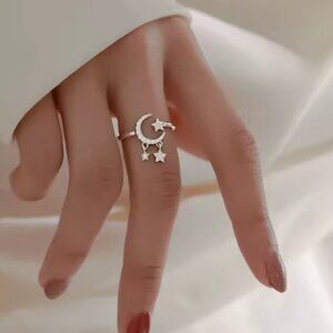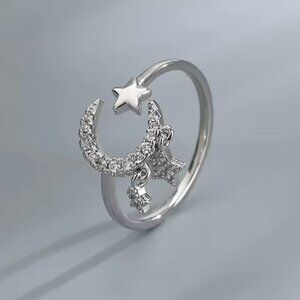 Silver Star and Moon Adjustable Ring with frosted diamonds