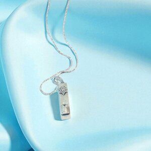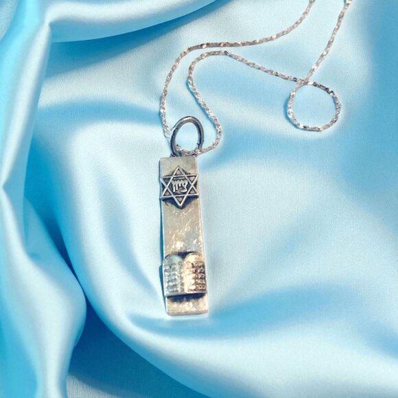 This Mezuzah pendant with an engraved Star of David and the Hebrew Ten Commandments - the foundation of all of Judaism on the front. The pendant is approx. 1 3/8” tall x 5/16” wide including a silver plate chain. Length: 18” – (New) Made from High-quality materials and craftsmanship, with a unique elegant design. Vintage 1960 Sold at auction for $109 without chain. See last photo