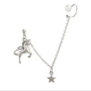 Mystical fantasy ear cuff earring! Silver hanging Unicorn horse with star dangling from ear wrap chain, with adjustable faux Pearl ear cuff earring! Ear piercing required.