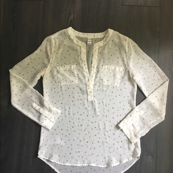 Beautiful long sleeve blouse, completely sheer so you'll have to wear a cami under it. Has buttons on the chest area, and silver stars all over.