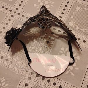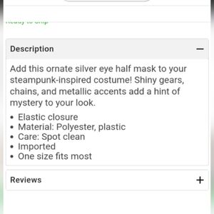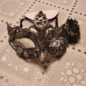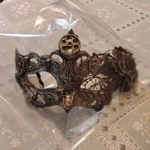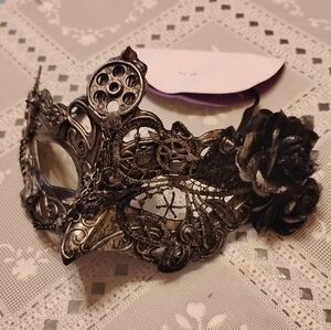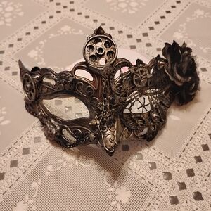 Add this ornate silver eye half mask to your steampunk-inspired costume! Shiny gears, chains, and metallic accents add a hint of mystery to your look.