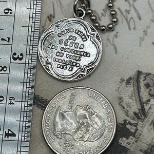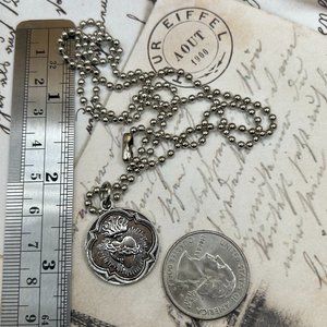 Smoke free. Heavier weight true vintage, smoke free religious Catholic medal pendant. Pictured with ruler to demonstrate size. Rulers, coin and backdrops not included. Medal is true vintage and shows wear, patina and age. Please see photos, as they are an important part of the description. Shown front and back. Catholic, religious, faith, jewelry, charm, keepsake, saints, religion, theme, fob, prayer. Silver tone. No hallmarks found. Sturdy weight silver colored metal, alloy. This will come to you carefully packed with tracking. Fast and reliable shipper. Costume jewelry, layering, necklace, gothic, goth, style, day of the dead.