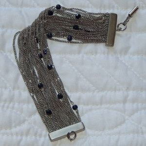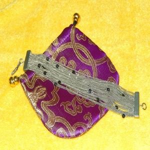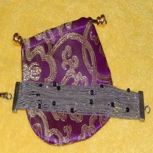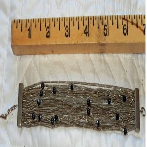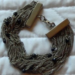 This awesome vintage BOHO bracelet consists of delicate silver chains strung with black beads. Vintage find in antique store so it's quite rare! Fits about a 7" wrist (or smaller) - see size image - the clasp serves as part of the bracelet. The silver stands are bound at each end with a silver bar. You will receive compliments. Statement piece. Jewelry bag included. Bundle & save. Offers welcome.