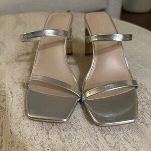 Elegant silver strappy heels with a sleek modern silhouette and square toe. Worn once for a wedding as a bridesmaid, good condition. Comfortable fit, great for weddings, parties or nights out.