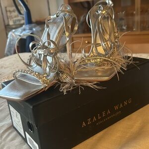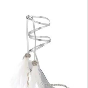 Step out in style with these stunning silver strappy heels. Featuring elegant feather details, these shoes are perfect for making a statement. Ideal for special occasions or a night out. Size 7.5 brand new with box