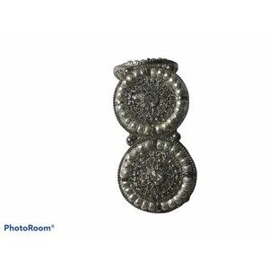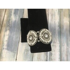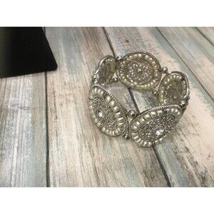 Silver stretchy medallion bracelet with rhinestones and silver beads.