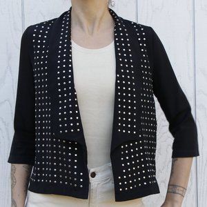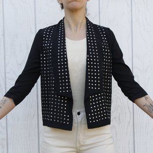 For those days you want to feel like a rockstar and still look polished. Fully studded blazer jacket in 100% poly, fully lined. Very silky fabric and moves beautifully with the weight of the studs. I get a ton of compliments in it, wears like silk but less fussy.