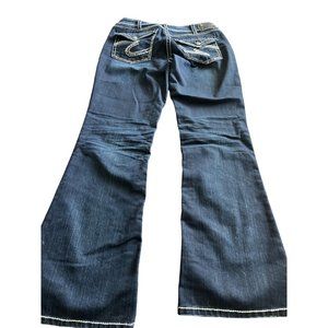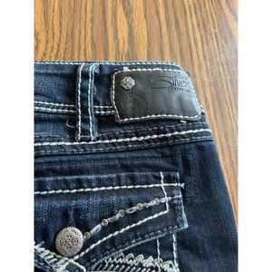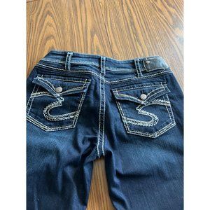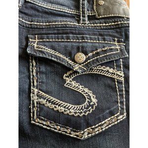 Silver Suki Flap woman’s bell bottom jeans with bling. Zip and button front. Pockets in front and back. White stitching. Faux rhinestones and silver buttons. Waist measures approximately 17” side to side. Rise measures approximately 9.5”. Inseam measures approximately 32”. Really nice pre-owned condition.