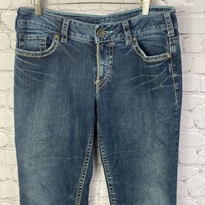 Classic Silver Suki jeans in excellent condition. Some wear on bottom cuffs- see pics. Smoke free home. Bundle and save! Check out my 5 star reviews. Inseam measures 34. Rise 9. Waist laying flat-16.5