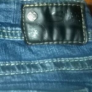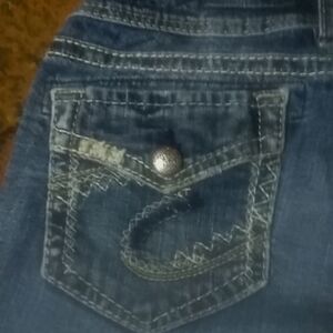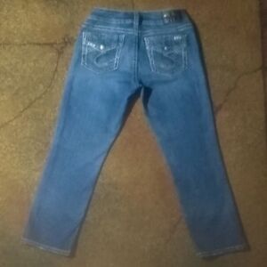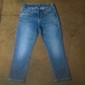 Silver Suki Mid Capris in a Medium Wash with Whiskering, Fading and Faux Flap Back Pockets. Excellent Condition.