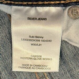 Silver Suki Skinny Slightly Distressed Jeans. Size 30x31. Inseam 31”. 9” rise. 93% cotton, 6% polyester, 1% Lycra elastane. 3 front pockets and 2 back pockets. Zip and button closure. Still in great used condition. Please see photos.