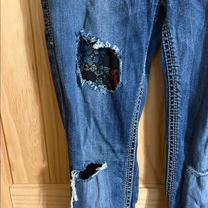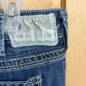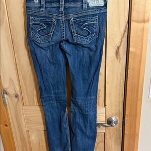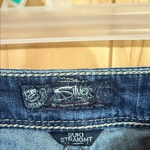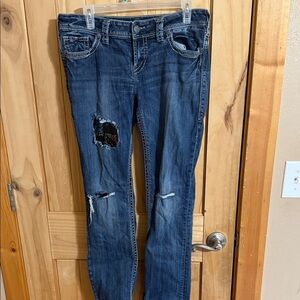 Chic dark blue Suki Straight Distressed jeans with stylish distressing. Perfect for a modern casual look. Crafted by Silver Jeans for comfort and style.