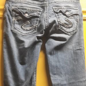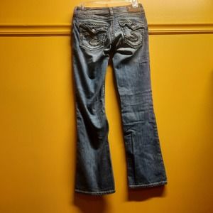 Silver Suki Super Stretch Denim Jeans Womens Mid Rise Slim Boot EUC. Contrast stitching and heavy embroidery on back pockets.