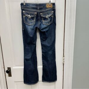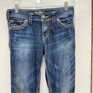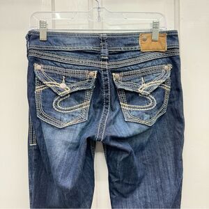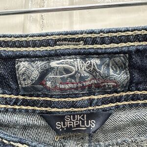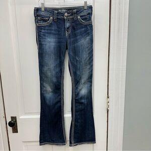 Silver Suki surplus bootcut thick stitch denim jeans women's 27 x 32. lightly distressed. missing button cover on back pocket