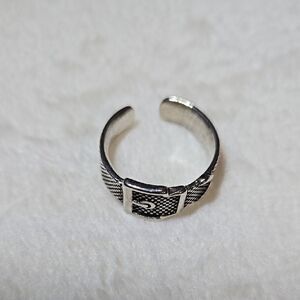 Elegant silver tone belt buckle ring with a unique textured design. Inventory box 2