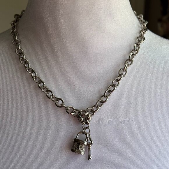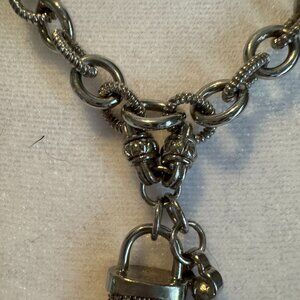 Silver Thick Chain Necklace with Lock and Key. Not adjustable and has a toggle clasp. Chain is on the heavier side. Lock has crushed crystals in it so it sparkles. In excellent used condition..
