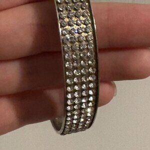 This bracelet is made with silver and rhinestones. This hasn't been used or worn in a long time and has no tarnishing.