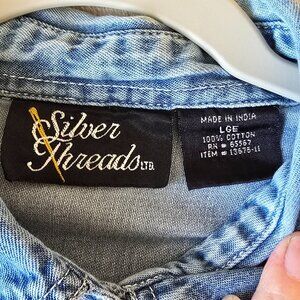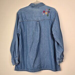 Silver Threads Embroidered Denim Shirt Women Size Large Floral Flowers Jean Art