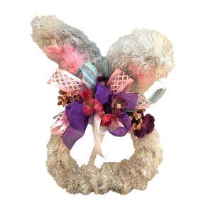 Silver Tinsel Easter Bunny Shaped Wreath With Floral & Ribbon Accents