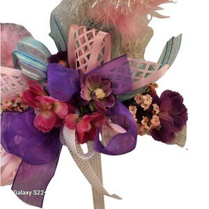 This elegant bunny-shaped wreath, adorned with silver tinsel, features vibrant floral and ribbon accents. Ideal for adding a whimsical touch to your decor during spring or Easter. The combination of textures and colors offers a sophisticated yet playful aesthetic, enhancing any space with its unique charm.