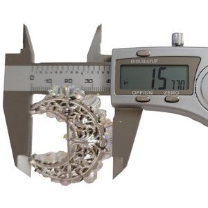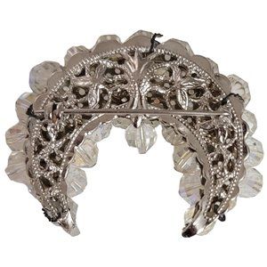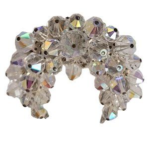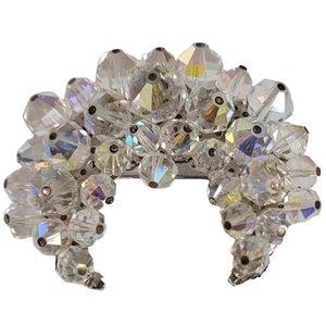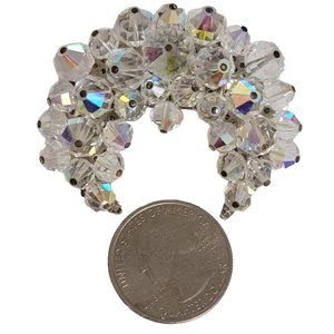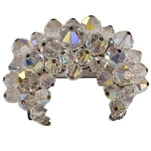Lovely shinning Crescent Moon Brooch fully packed with sparkling Aurora Borealis beads set on a Filigree style crescent moon-shaped silver tone base. It measures approximately 1.9 inches in width and 1.5 inches in length. Although this brooch is unsigned, the delicate and exquisite detailing matches Designer-style costume jewelry. The back has a secure locking pin that functions properly, which is sturdy and secure, allowing this piece to be easily attached to your clothing, favorite handbag, or black pashmina scarf. This wonderful vintage accessory is designed to complement a wide range of outfits and accessories.