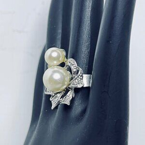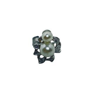 This elegant silver tone ring features a ribbon design adorned with sparkling rhinestones and two faux pearls, offering a timeless and sophisticated look.