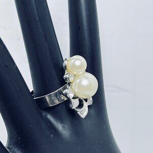Silver Tone And Rhinestone With 2 Faux Pearls Ribbon Ring (R434)