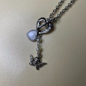 Silver Tone Angel Charm Necklace with Heart Toggle & Faux Pearl Drop